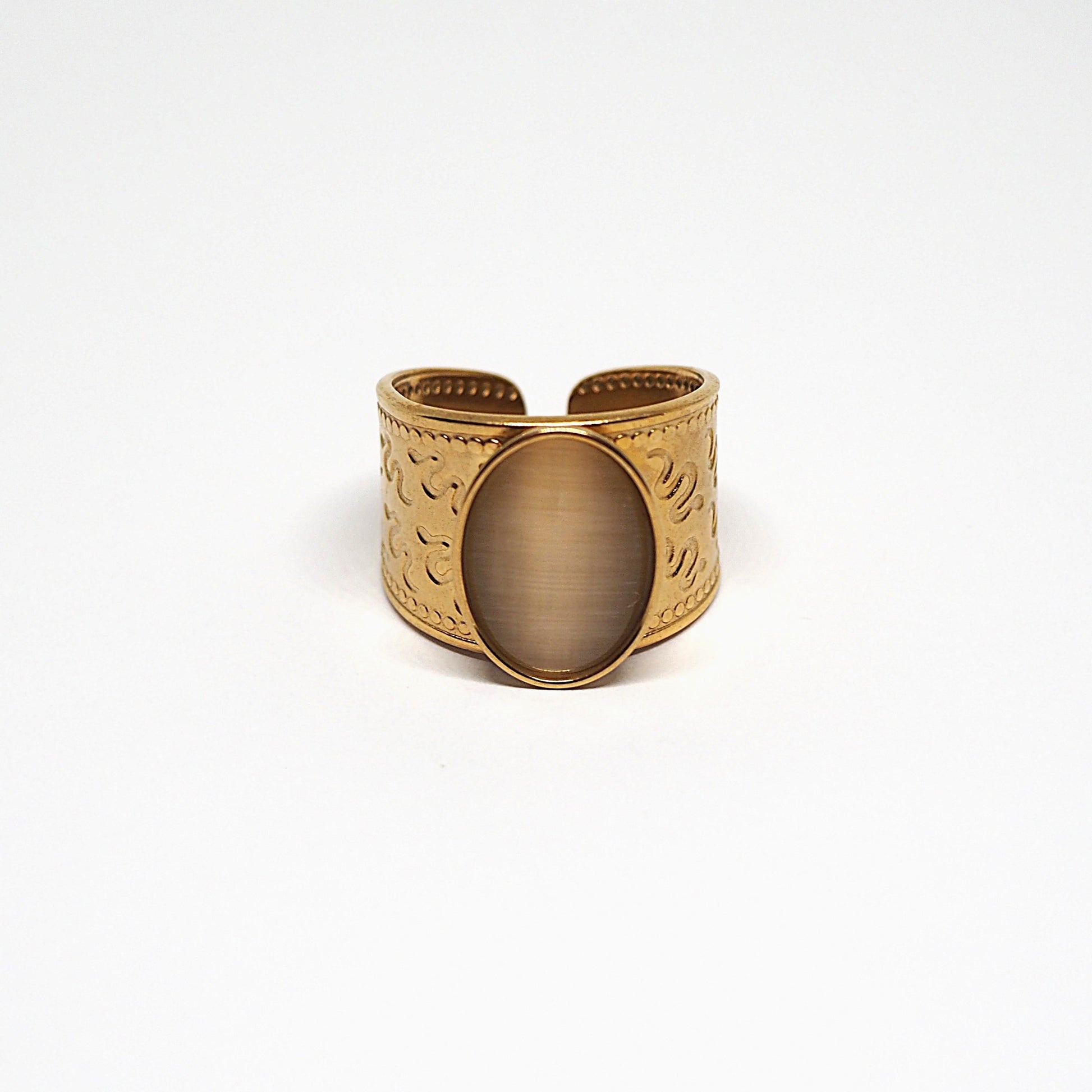 Bague ajustable en acier inoxydable doré. Sertie d'une pierre.