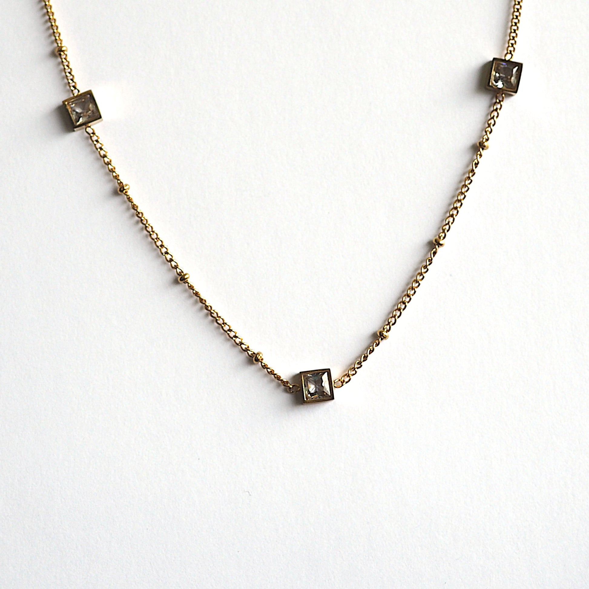 Collier en acier inoxydable doré, sertie de trois pierres taillées.